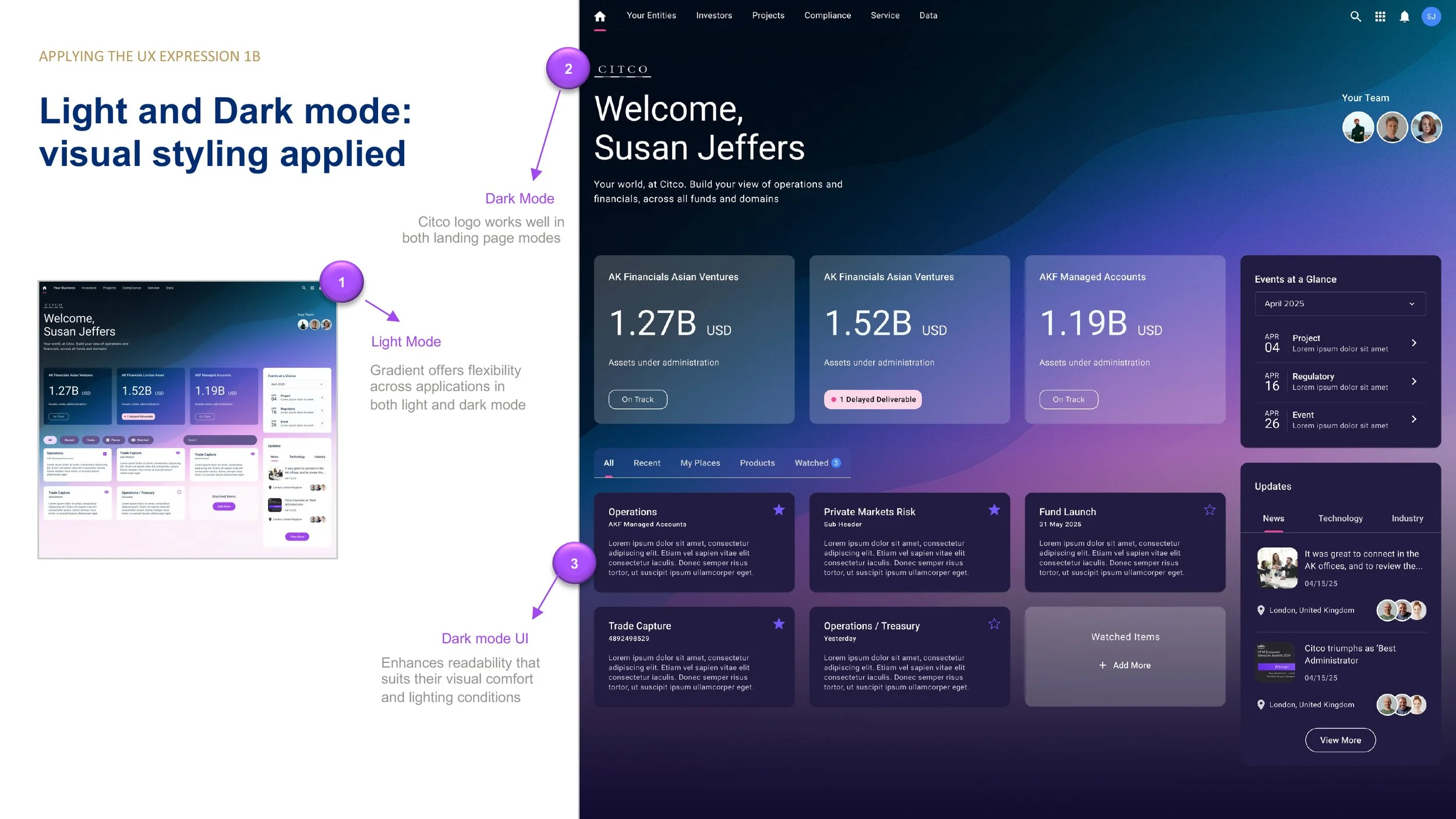 Once the direction was selected, I applied the visual language to high-fidelity product screens, including the Citco One dashboard.