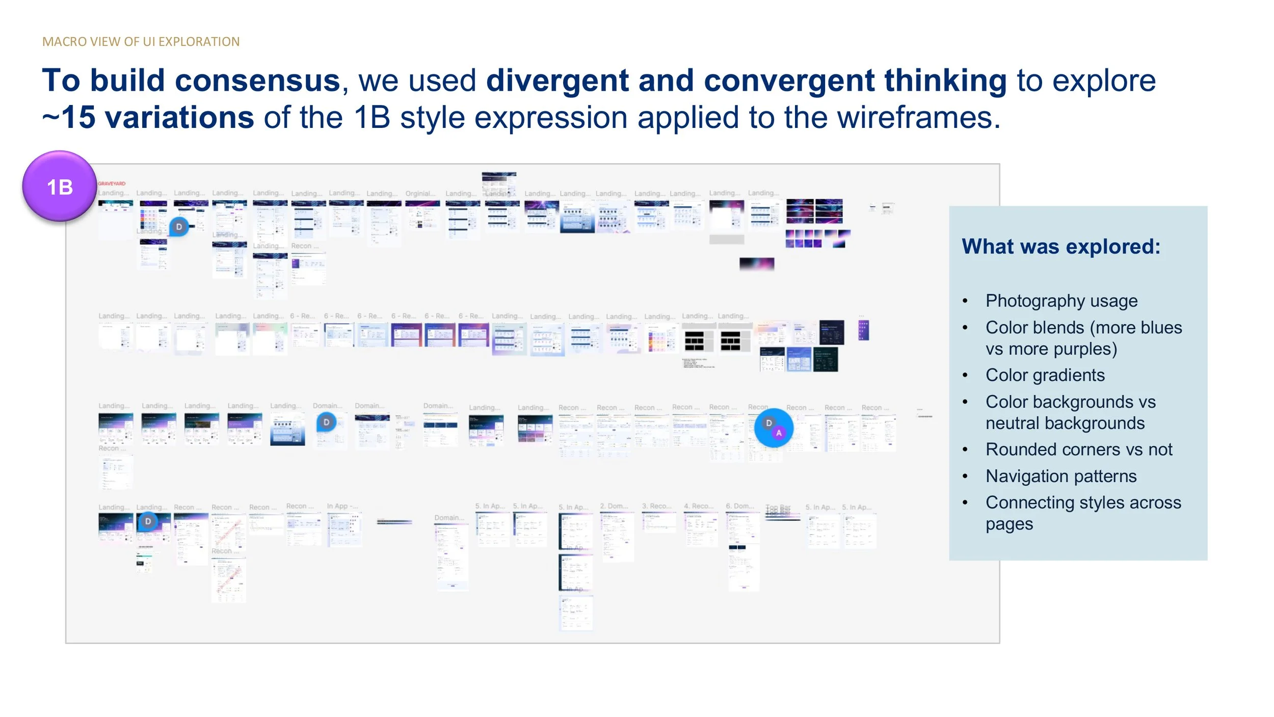 To build consensus, we applied divergent and convergent thinking, producing roughly 15 variations of the selected UI expression across wireframes. This allowed stakeholders to evaluate:
