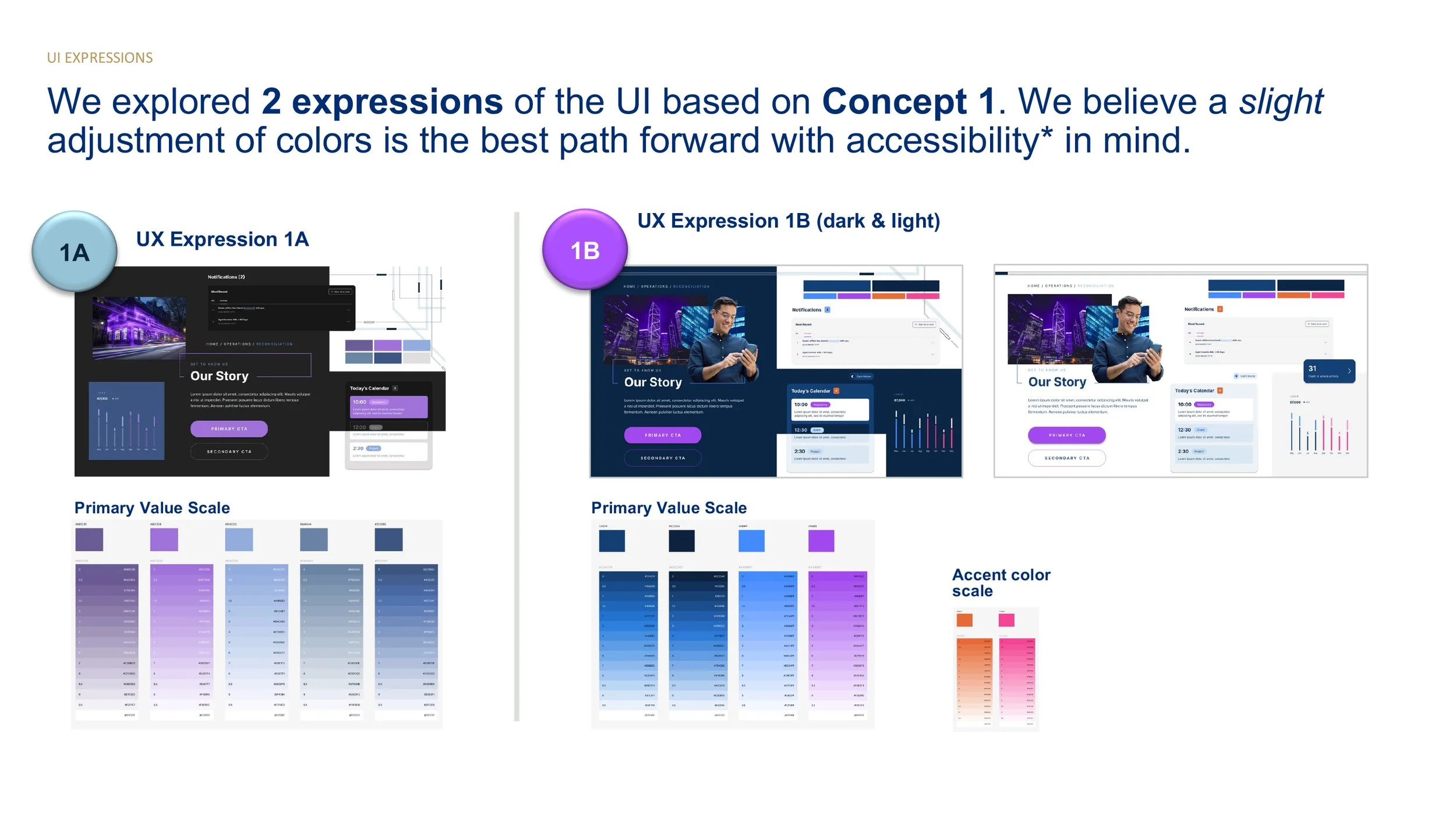 I translated this direction into UI expressions, exploring both light and dark themes while validating color accessibility against WCAG AA standards. Early concepts were visually compelling but failed accessibility thresholds, so I refined primary value scales, gradients, and accent colors to ensure compliance without losing brand energy.