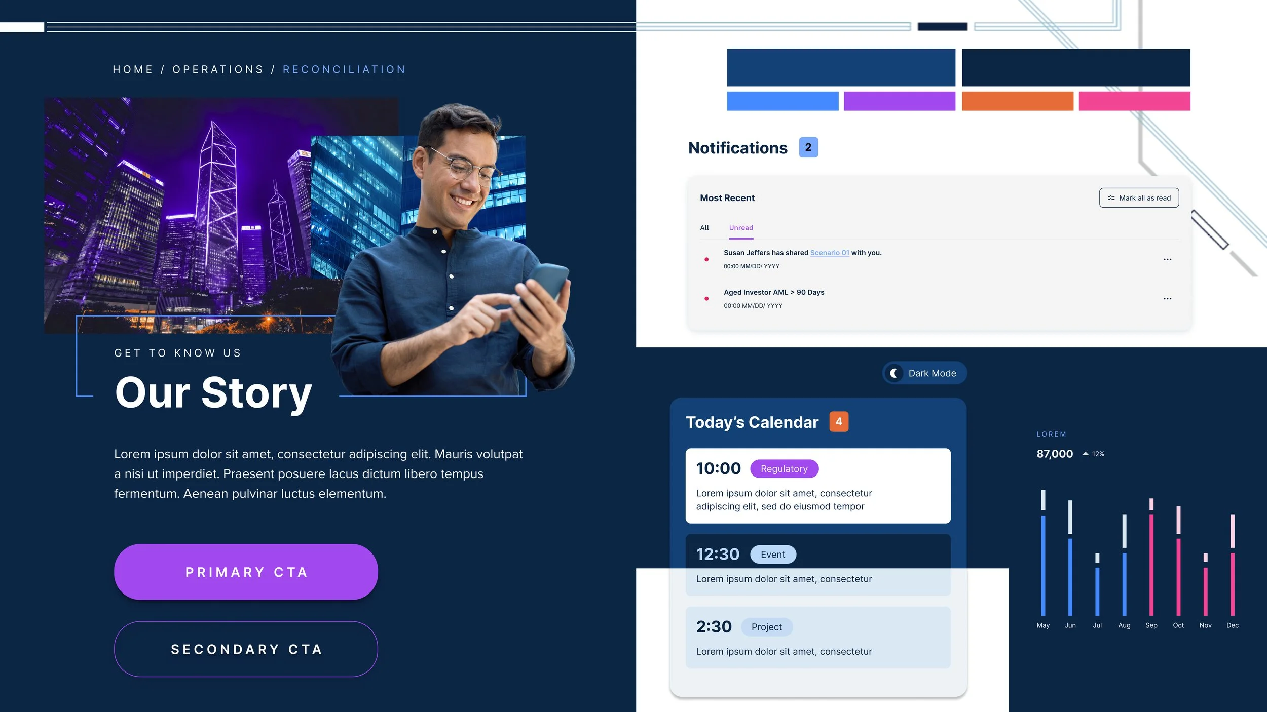 We then refined the color system and ran WCAG AA contrast checks to ensure the design was accessible and ready for enterprise use. Once approved, the direction was applied to high fidelity screens across both light and dark modes.