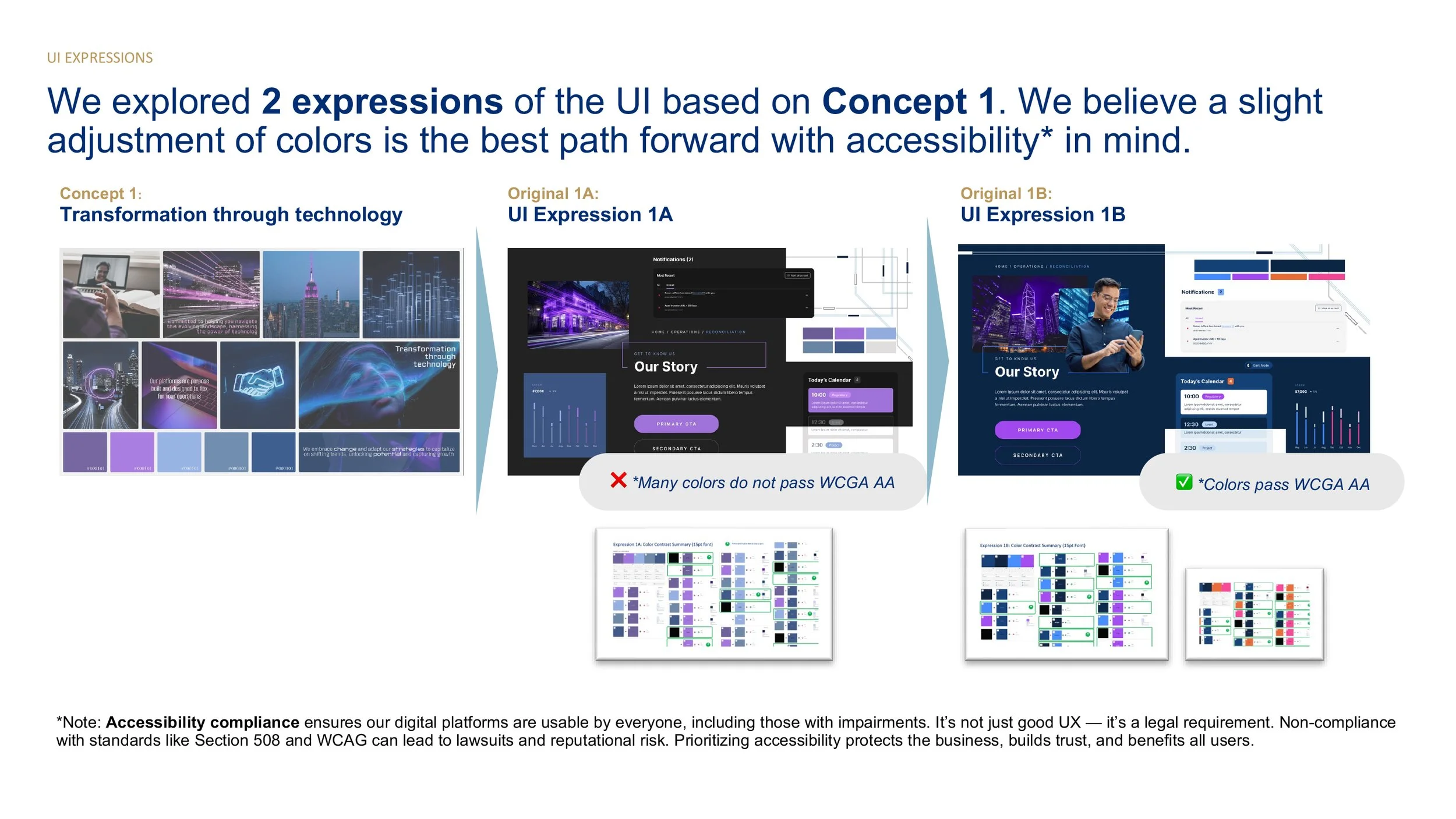 We evaluated early design directions against accessibility standards and refined the color system to meet WCAG AA requirements.